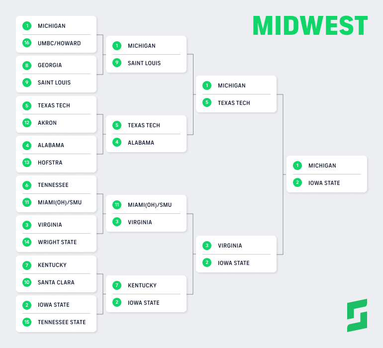 In the always-important 8 vs. 9 matchup, No. 9 Saint Louis from the A-10 squeaks past No. 8 Georgia from the SEC. Saint Louis opened the season as one of the hottest teams in the country, but limps into March after going 4-4 in its last eight games. Elsewhere, No. 5 Texas Tech overcomes the injury to JT Toppin and gets past strong perimeter teams in Akron and Alabama to meet Michigan in the Sweet 16. And in a major shocker, the play-in winner of SMU vs. Miami (Ohio) upsets Tennessee and advances to the Round of 32 in the 2026 NCAA Tournament bracket.
