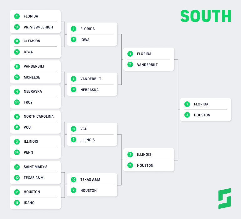 There's plenty of chaos right off the bat in the South Region of the 2026 NCAA Tournament bracket with three higher seeds advancing in the first round, including No. 11 VCU taking down blue blood and No. 6 seed North Carolina. The Tar Heels lost star freshman Caleb Wilson for the season with a thumb injury, and that ends up hurting UNC against a strong VCU squad. No. 9 Iowa takes down No. 8 Clemson, while No. 10 Texas A&M upsets No. 7 Saint Mary's. In the second round, No. 5 Vanderbilt squeezes past No. 4 Nebraska. No. 2 Houston then slips past defending champion Florida to advance.
